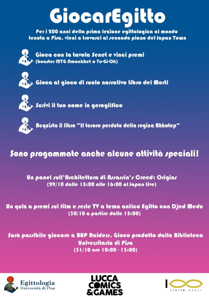 Al banco di Egittologia UniPi sarà infatti possibile scrivere il proprio nome in geroglifico, giocare alla Senet, millenario gioco da tavola in voga nell’antico Egitto, giocare al “Libro dei Morti”, gioco di ruolo narrativo prodotto dalla Centum Oculi, e acquistare il libro “Il tesoro perduto della regina Ahhotep” del professor Gianluca Miniaci. Saranno inoltre previste attività speciali: il 29 ottobre, alle 15.00 presso il palco del Japan Live, Mattia Mancini, egittologo e divulgatore dell’Università di Pisa, terrà un panel sui riferimenti egittologici presenti nel videogame “Assassin’s Creed: Origins”; il giorno seguente, sempre dalle 15:00, si terrà un quiz sull’antico Egitto nel cinema e nelle serie TV; infine, la mattina del 31 ottobre, grazie alla collaborazione con la Biblioteca Universitaria di Pisa, si potrà giocare a “BUP Raiders”. Per ogni gioco saranno messi in palio gadget e premi a tema.
